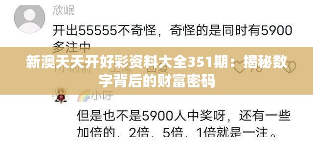 在澳门这个东方蒙地卡罗,财富和机遇并存。新澳天天开好彩资料大全351期正是这样一份为您提供财富导向和数字分析的综合资料。揭秘那些看似平淡无常的数字背后隐藏的财富秘密,为投资者和彩票爱好者开启一扇扇通往成功的大门。本文深入探讨了这些数字背后的财富密码,帮助您在澳门的彩票市场获得更大的胜算和投资回报。