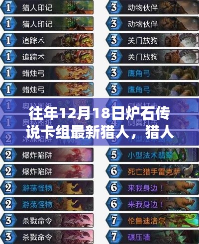 2、十二月十八日的变革:随着时间的推移,游戏平衡性的调整以及新卡的发布,猎人职业经历了重大变革,每年的十二月十八日,新的卡牌更新往往给猎人带来新的机遇与挑战,这些更新往往决定了接下来一段时间内猎人卡组的主流构建和玩法。