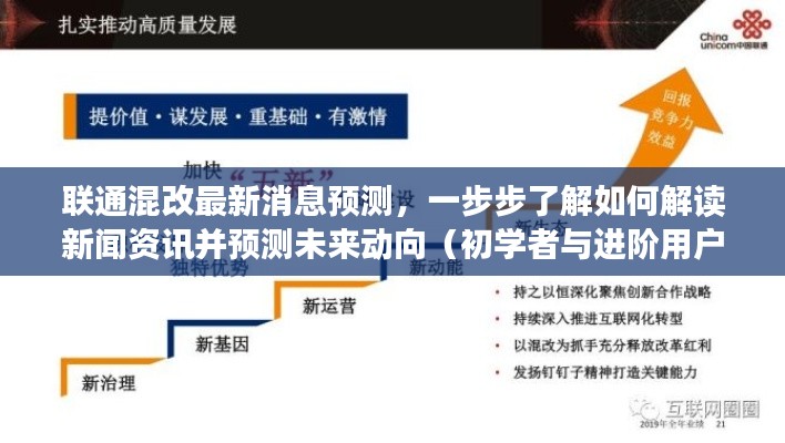 摘要:联通混改最新动态引发关注,新闻解读与未来动向预测成为焦点。本文旨在为初学者和进阶用户提供指南,了解如何分析新闻资讯,预测未来发展趋势。通过关注政策动向、市场反应和行业趋势等方面,结合联通混改案例,逐步解读新闻背后的深层含义,为预测未来动向提供思路。联通混改进展将持续影响通信行业格局,值得关注。