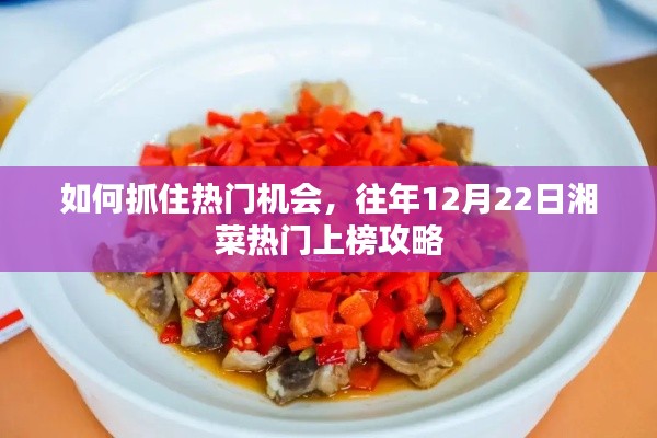 摘要:在每年的热门时段,抓住机遇至关重要。对于想要了解如何在往年12月22日抓住湘菜热门上榜机会的人来说,攻略如下:关注市场趋势,了解消费者喜好;精心策划特色菜品,注重创新;加强营销推广,利用社交媒体等渠道提高知名度;提升服务质量,确保顾客满意度;同时注重口碑传播,形成良好的品牌形象。这些策略有助于抓住热门机会,成功上榜。