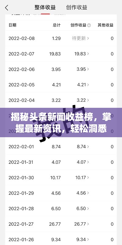 随着互联网的普及和数字化时代的来临,越来越多的人开始关注新闻资讯,尤其是头条新闻,而对于那些希望通过新闻获取收益的人来说,了解头条新闻的收益榜无疑是一个重要的环节,本文将指导您如何查看头条新闻收益榜,让您轻松掌握最新资讯,洞悉收益动态。