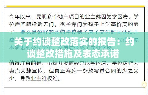 近期,根据上级部门的要求,我单位对近期工作中存在的问题进行了全面自查,发现部分工作存在不足,为切实提高工作效率和服务质量,确保各项工作落到实处,经研究决定,对我单位部分部门及个人进行约谈整改。以下是对此次约谈整改落实情况的报告。
