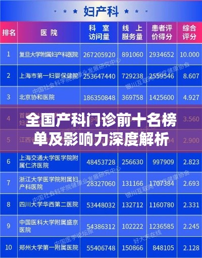 随着人们对生育健康的关注度不断提高,选择一个优质的产科门诊成为了许多准妈妈们关注的焦点,本文将介绍全国产科门诊排名前十名,并深入分析其影响力及优势所在。