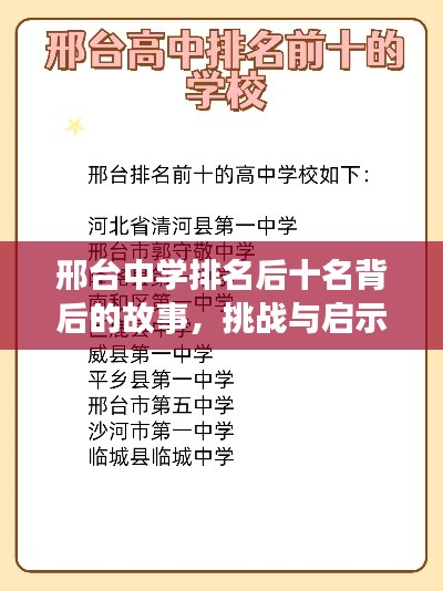 邢台市是河北省的一个重要城市,拥有众多中学,在竞争激烈的中学教育领域,每所学校的表现并不总是尽如人意,本文将探讨邢台市中学排名后十名的情况,旨在深入了解这些学校的现状,并提出一些建议以推动其改进。