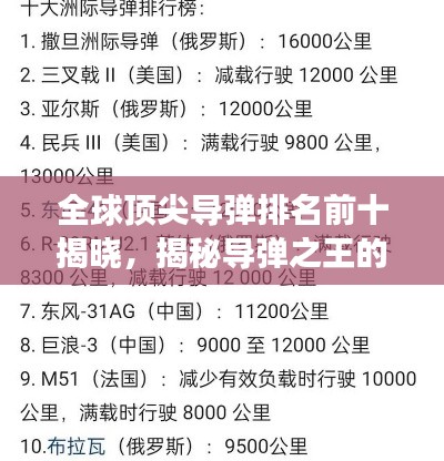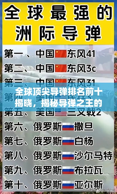 随着科技的飞速发展,导弹技术已成为各国军事力量的重要组成部分,在这篇文章中,我们将为您揭晓全球导弹之王的前十名排名,带您领略这些顶尖导弹的威力与战略价值。