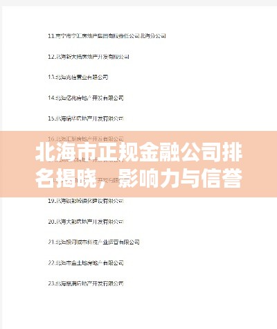 北海市的正规金融公司排名及其影响力不容忽视,它们在金融服务创新、经济发展推动以及风险管理与合规经营等方面表现出色,市民和企业在选择金融服务时,应优先选择正规金融公司,以保障自身权益。