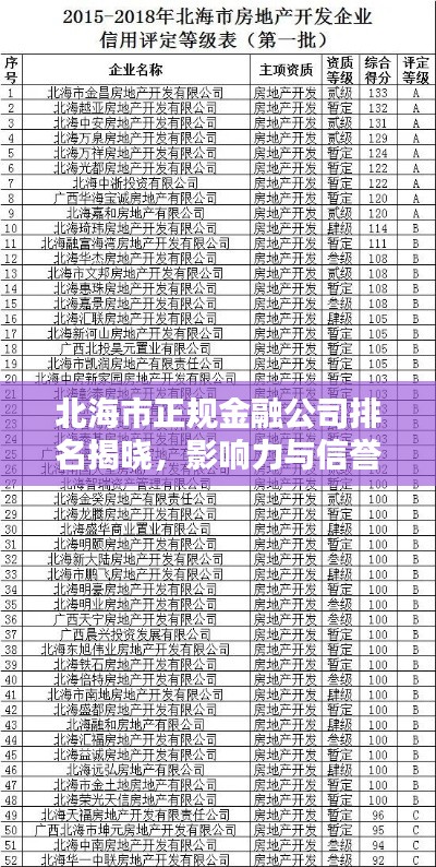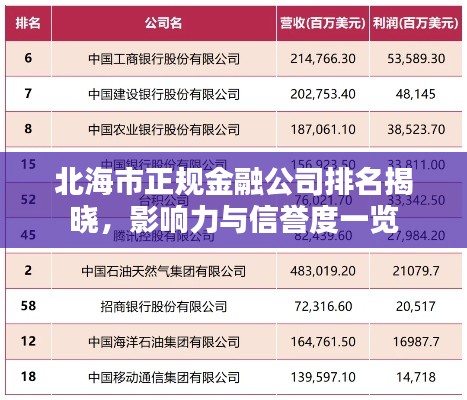 北海市作为广西的重要经济城市,金融市场日益繁荣,众多金融公司如雨后春笋般涌现,本文将探讨北海市正规金融公司的排名及其影响力,为广大市民和企业提供参考。