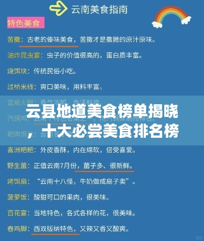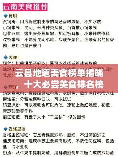 云南,以其丰富的自然景观和独特的人文风情著称于世,而在这片多彩的土地上,美食文化同样独树一帜,云县作为云南省的一个缩影,拥有众多地道美食,本文将为您揭晓云县地道美食排名前十名,带您领略这片土地上的美食魅力。
