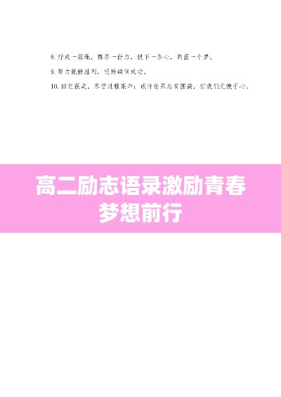 面对高二的挑战和机遇,我们要勇往直前、拼搏进取、志存高远、团结协作、坚持不懈、自信自强、珍惜时光、积极向上,让我们共同用这些励志语录口号激发内心的力量,迎接高二的挑战,创造属于我们的辉煌!