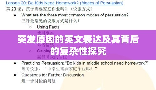在我们的日常生活中,突发事件时常发生,它们可能关乎健康、安全、环境、社会事件等各个方面,理解突发的原因,无论对于个人还是社会,都具有至关重要的意义,本文将探讨突发原因的英文表达及其背后的复杂性。