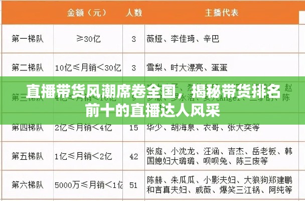 随着互联网的普及和直播行业的飞速发展,直播带货已经成为一种新兴的消费模式,越来越多的消费者通过观看直播购买商品,而许多商家也借助直播平台推广产品,实现销售增长,本文将为你介绍直播带货排名前十的直播达人,带你领略他们的魅力与影响力。